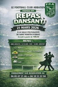 Le FOOTBALL CLUB ABBATIEN vous propose son repas dansant à la salle polyvalente - 62 rue des Maux Petits, le samedi 21 mars 2026 avec un accueil à partir de 19h30.