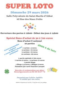 organisé par LOISIRS AMITIES le dimanche 29 mars 2026 - Ouvertures des portes dès 12 heures - début des jeux à 14 heures à la salle polyvalente 62 rue des maux petits Saint-Martin d'Abbat.