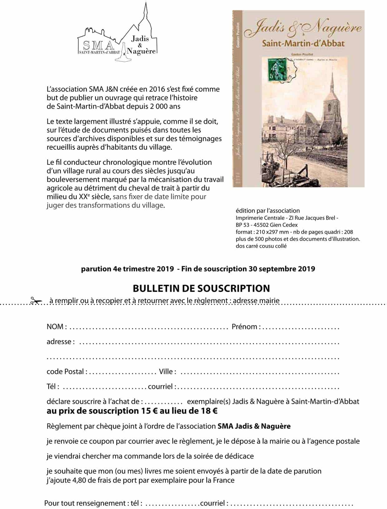 L’association SMA JADIS & NAGUERE créée en 2016 s’est fixé comme but de publier un ouvrage qui retrace l’histoire de Saint-Martin-d’Abbat depuis 2 000 ans. Une parution prévue 4ème trimestre 2019 avec une fin de souscription au 30 septembre 2019.