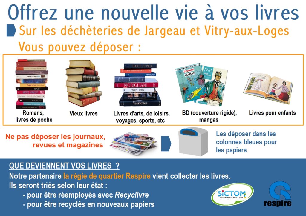 Dès aujourd’hui, vous pouvez déposer vos textiles à la déchèterie de Châteauneuf-sur-Loire. Un conteneur réemploi est entièrement consacré aux dépôts de vos textiles : vêtements, chaussures, linge de maison et maroquinerie que vous ne voulez plus garder auront une 2ème vie grâce au SICTOM et à la Régie de quartier Respire.
