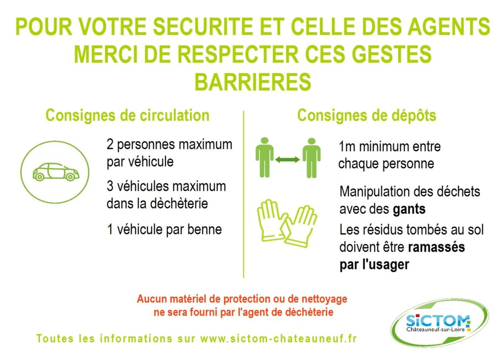 Optimisez votre chargement : chargez votre véhicule en regroupant les déchets de même catégorie de manière à faciliter vos dépôts et améliorer le tri.  Veiller à bien utiliser les différentes bennes pour trier les déchets : ferrailles, gravats, cartons, appareils électriques usagés. Beaucoup de ces déchets se retrouvent dans la benne tout venant qui se remplit plus rapidement. Voir les déchets acceptés en déchèteries ; Pliez vos cartons et videz-les de leur contenu Limitez vos dépôts à 2 m3 (comme indiqué dans le règlement des déchèteries) ; les apports d’un volume supérieur peuvent être refusés. Prévoyez votre matériel pour décharger votre véhicule Reportez vos dépôts lorsque cela est possible Respectez les gestes barrières suivants en vigueur :
